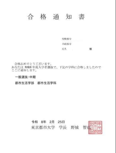 東京都市大学 都市生活学部(2026/02)→合格証明書